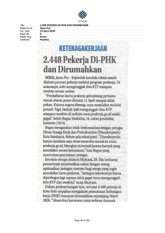 Title 2.448 PEKERJA DI-PHK DAN DIRUMAHKAN Media Name Jawa Pos Pub. Date 19 April 2020 Page/URL 6 Media Type Koran Sentiment Positive Page 49 of 355.