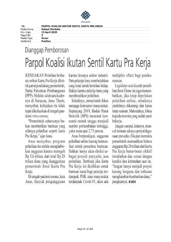 Title PARPOL KOALISI IKUTAN SENTIL KARTU PRA KERJA Media Name Rakyat Merdeka Pub. Date 19 April 2020 Page/URL 3 Media Type Koran Sentiment Positive Page 51 of 355.