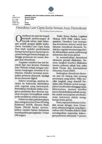 Title OMNIBUS LAW CIPTA KERJA SESUAI AZAS DEMOKRASI Media Name Ekonomi Neraca Pub. Date 20 April 2020 Page/URL 2 Media Type Koran Sentiment Positive Page 6 of 355.