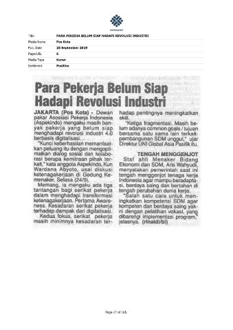 Title PARA PEKERJA BELUM SIAP HADAPI REVOLUSI INDUSTRI Media Name Pos Kota Pub. Date 25 September 2019 Page/URL 6 Media Type Koran Sentiment Positive Page 17 of 165.
