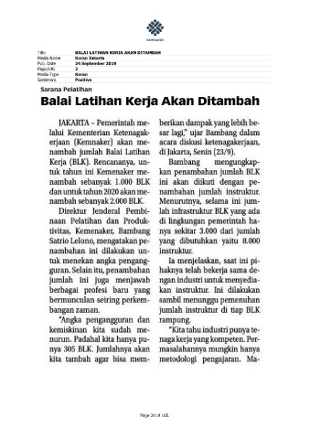 Title BALAI LATIHAN KERJA AKAN DITAMBAH Media Name Koran Jakarta Pub. Date 24 September 2019 Page/URL 2 Media Type Koran Sentiment Positive Page 28 of 165.