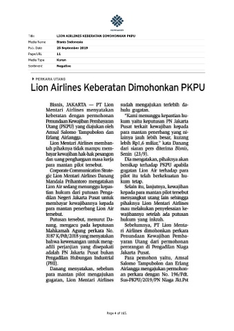 Title LION AIRLINES KEBERATAN DIMOHONKAN PKPU Media Name Bisnis Indonesia Pub. Date 25 September 2019 Page/URL 11 Media Type Koran Sentiment Negative Page 4 of 165.