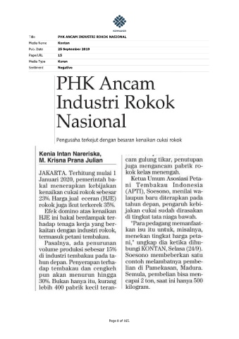 Title PHK ANCAM INDUSTRI ROKOK NASIONAL Media Name Kontan Pub. Date 25 September 2019 Page/URL 15 Media Type Koran Sentiment Negative Page 8 of 165.