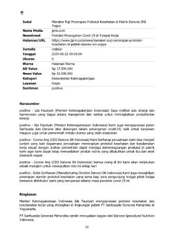 Judul Menaker Puji Penerapan Protokol Kesehatan di Pabrik Danone SNI