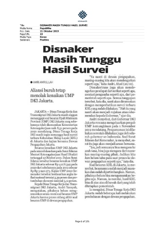 Title DISNAKER MASIH TUNGGU HASIL SURVEI Media Name Republika Pub. Date 21 Oktober 2019 Page/URL 22 Media Type Koran Sentiment Positive Page 6 of 329.