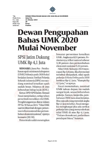 Title DEWAN PENGUPAHAN BAHAS UMK 2020 MULAI NOVEMBER Media Name Jawa Pos Pub. Date 21 Oktober 2019 Page/URL 29 Media Type Koran Sentiment Positive Page 8 of 329.
