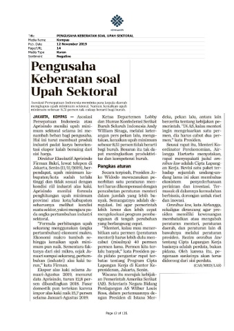 Title PENGUSAHA KEBERATAN SOAL UPAH SEKTORAL Media Name Kompas Pub. Date 12 November 2019 Page/URL 14 Media Type Koran Sentiment Negative Page 12 of 135.