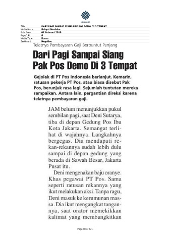 Title DARI PAGI SAMPAI SIANG PAK POS DEMO DI 3 TEMPAT Media Name Rakyat Merdeka Pub. Date 07 Februari 2019 Page/URL 8 Media Type Koran Sentiment Negative Page 18 of 121.