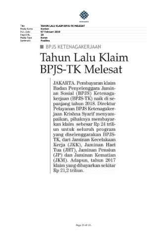 Title TAHUN LALU KLAIM BPJS-TK MELESAT Media Name Kontan Pub. Date 07 Februari 2019 Page/URL 20 Media Type Koran Sentiment Positive Page 23 of 121.