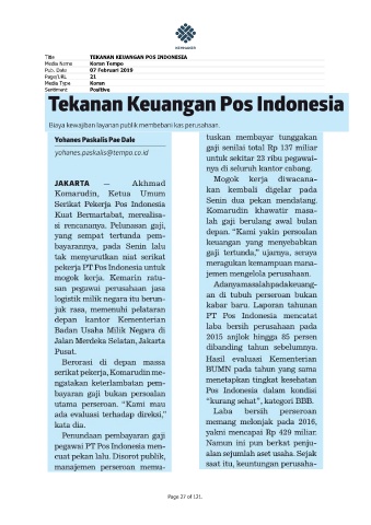 Title TEKANAN KEUANGAN POS INDONESIA Media Name Koran Tempo Pub. Date 07 Februari 2019 Page/URL 21 Media Type Koran Sentiment Positive Page 27 of 121.