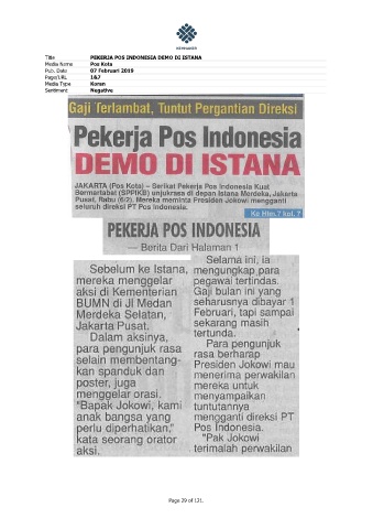 Title PEKERJA POS INDONESIA DEMO DI ISTANA Media Name Pos Kota Pub. Date 07 Februari 2019 Page/URL 1&7 Media Type Koran Sentiment Negative Page 29 of 121.