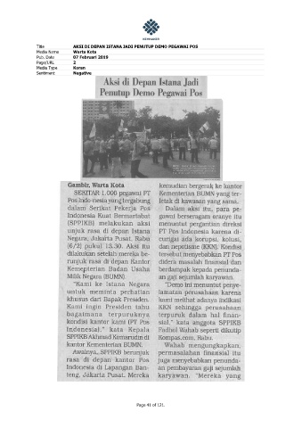 Title AKSI DI DEPAN ISTANA JADI PENUTUP DEMO PEGAWAI POS Media Name Warta Kota Pub. Date 07 Februari 2019 Page/URL 2 Media Type Koran Sentiment Negative Page 41 of 121.