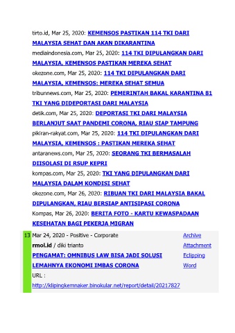 tirto.id, Mar 25, 2020: KEMENSOS PASTIKAN 114 TKI DARI