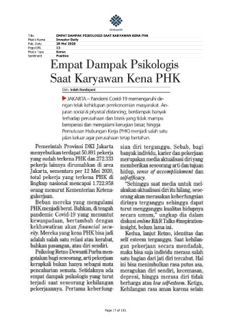 Title EMPAT DAMPAK PSIKOLOGIS SAAT KARYAWAN KENA PHK Media Name Investor Daily Pub. Date 28 Mei 2020 Page/URL 13 Media Type Koran Sentiment Positive Page 17 of 130.