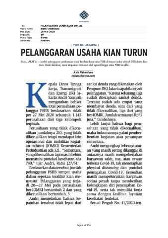 Title PELANGGARAN USAHA KIAN TURUN Media Name Bisnis Indonesia Pub. Date 28 Mei 2020 Page/URL 10 Media Type Koran Sentiment Positive Page 4 of 130.