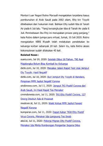 suara.com, Jul 10, 2020: Setelah Dibui 18 Tahun, TKI Asal