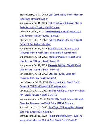 okezone.com, Jul 12, 2020: Pekerja Migran Etty Toyib Positif