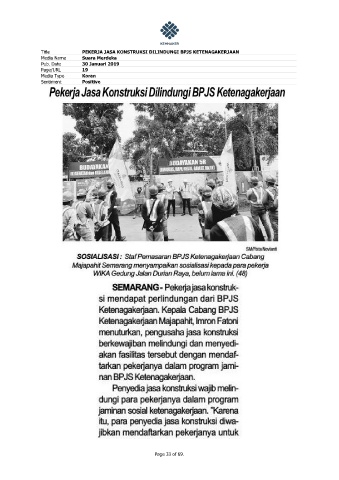 Title PEKERJA JASA KONSTRUKSI DILINDUNGI BPJS KETENAGAKERJAAN Media Name Suara Merdeka Pub. Date 30 Januari 2019 Page/URL 19 Media Type Koran Sentiment Positive Page 33 of 69.