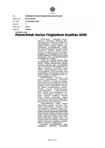 Title PEMERINTAH SERIUS TINGKATKAN KUALITAS SDM Media Name Koran Jakarta Pub. Date 14 Desember 2018 Page/URL 4 Media Type Koran Sentiment Positive Page 20 of 51.