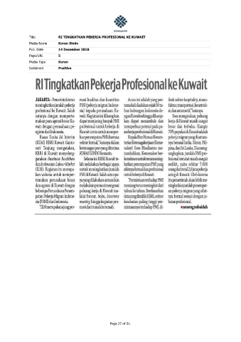 Title RI TINGKATKAN PEKERJA PROFESIONAL KE KUWAIT Media Name Koran Sindo Pub. Date 14 Desember 2018 Page/URL 5 Media Type Koran Sentiment Positive Page 27 of 51.