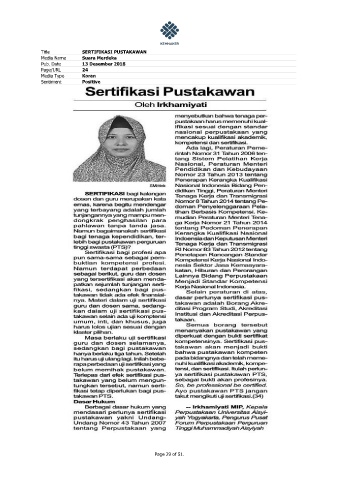 Title SERTIFIKASI PUSTAKAWAN Media Name Suara Merdeka Pub. Date 13 Desember 2018 Page/URL 24 Media Type Koran Sentiment Positive Page 29 of 51.