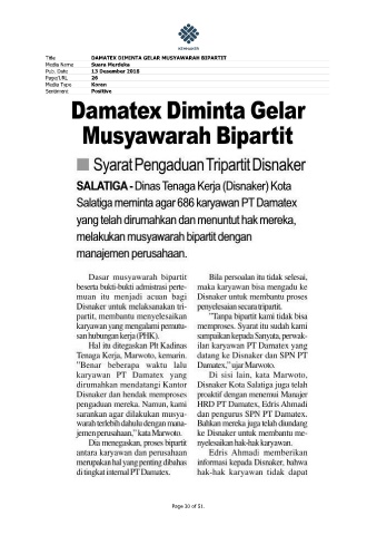 Title DAMATEX DIMINTA GELAR MUSYAWARAH BIPARTIT Media Name Suara Merdeka Pub. Date 13 Desember 2018 Page/URL 26 Media Type Koran Sentiment Positive Page 30 of 51.