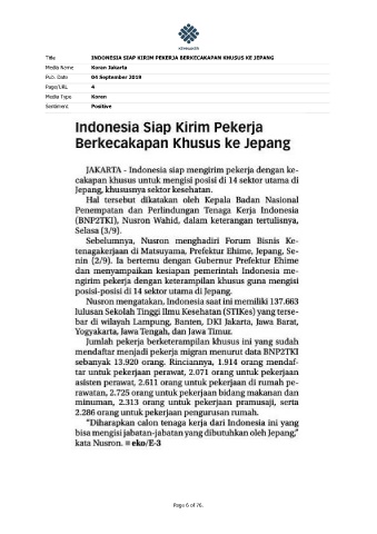 Title INDONESIA SIAP KIRIM PEKERJA BERKECAKAPAN KHUSUS KE JEPANG Media Name Koran Jakarta Pub. Date 04 September 2019 Page/URL 4 Media Type Koran Sentiment Positive Page 6 of 76.
