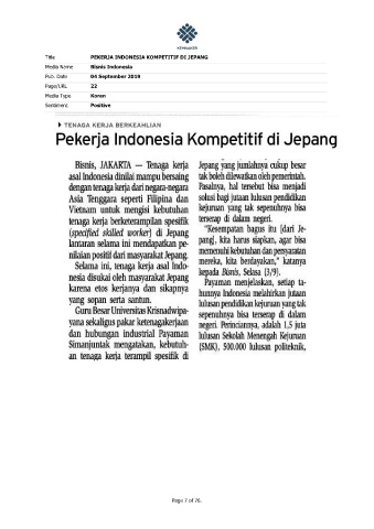 Title PEKERJA INDONESIA KOMPETITIF DI JEPANG Media Name Bisnis Indonesia Pub. Date 04 September 2019 Page/URL 22 Media Type Koran Sentiment Positive Page 7 of 76.