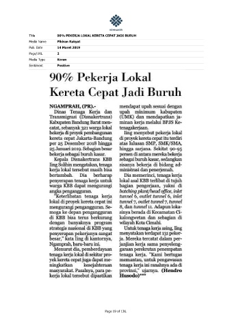 Title 90% PEKERJA LOKAL KERETA CEPAT JADI BURUH Media Name Pikiran Rakyat Pub. Date 14 Maret 2019 Page/URL 2 Media Type Koran Sentiment Positive Page 19 of 136.