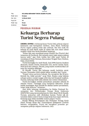 Title KELUARGA BERHARAP TURINI SEGERA PULANG Media Name Kompas Pub. Date 14 Maret 2019 Page/URL 19 Media Type Koran Sentiment Positive Page 5 of 136.
