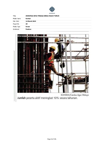 Title INVESTASI BPJS TENAGA KERJA MASIH TURUN Media Name Kontan Pub. Date 14 Maret 2019 Page/URL 20 Media Type Koran Sentiment Positive Page 8 of 136.