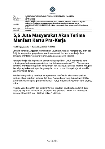 Page/URL ead/2020/04/08/320/2196255/5-6-juta-masyarakat-akan-terima-manfaat-kar tu-pra-