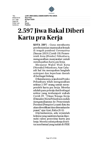 Title 2.597 JIWA BAKAL DIBERI KARTU PRA KERJA Media Name Riau Post Pub. Date 09 April 2020 Page/URL 20 Media Type Koran Sentiment Positive Page 337 of 394.