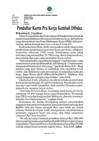 Title PENDAFTAR KARTU PRA KERJA KEMBALI DIBUKA Media Name Analisa Daily Pub. Date 09 April 2020 Page/URL 6 Media Type Koran Sentiment Positive Page 357 of 394.