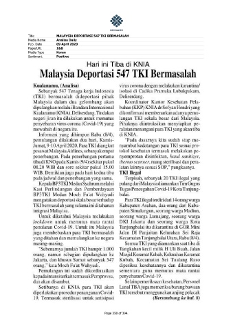 Title MALAYSIA DEPORTASI 547 TKI BERMASALAH Media Name Analisa Daily Pub. Date 09 April 2020 Page/URL 1&8 Media Type Koran Sentiment Positive Page 358 of 394.