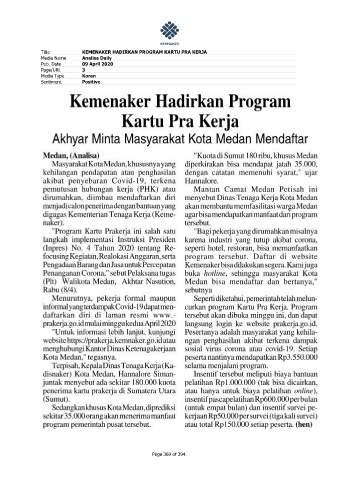 Title KEMENAKER HADIRKAN PROGRAM KARTU PRA KERJA Media Name Analisa Daily Pub. Date 09 April 2020 Page/URL 3 Media Type Koran Sentiment Positive Page 360 of 394.