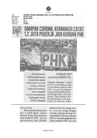 Title DAMPAK CORONA, KEMNAKER CATAT 1,2 JUTA PEKERJA JADI KORBAN PHK Media Name Harian Terbit Pub. Date 09 April 2020 Page/URL 10 Media Type Koran Sentiment Positive Page 362 of 394.