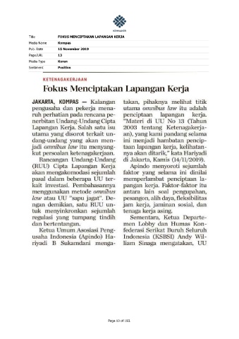 Title FOKUS MENCIPTAKAN LAPANGAN KERJA Media Name Kompas Pub. Date 15 November 2019 Page/URL 13 Media Type Koran Sentiment Positive Page 10 of 193.