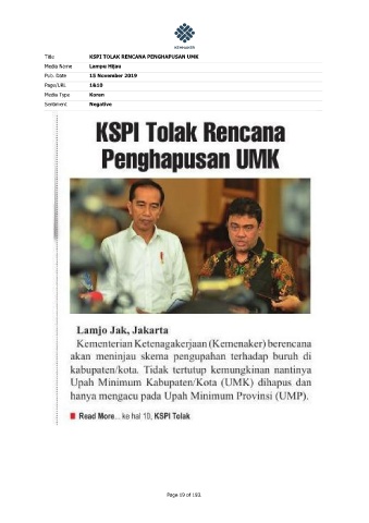 Title KSPI TOLAK RENCANA PENGHAPUSAN UMK Media Name Lampu Hijau Pub. Date 15 November 2019 Page/URL 1&10 Media Type Koran Sentiment Negative Page 19 of 193.