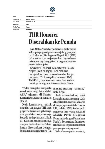 Title THR HONORER DISERAHKAN KE PEMDA Media Name Radar Bogor Pub. Date 16 Mei 2019 Page/URL 1&3 Media Type Koran Sentiment Positive Page 63 of 144.