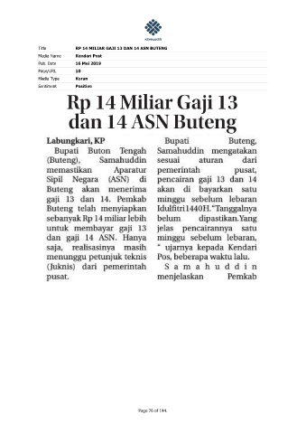 Title RP 14 MILIAR GAJI 13 DAN 14 ASN BUTENG Media Name Kendari Post Pub. Date 16 Mei 2019 Page/URL 10 Media Type Koran Sentiment Positive Page 76 of 144.