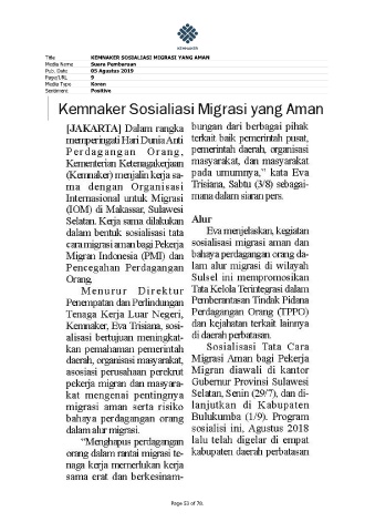 Title KEMNAKER SOSIALIASI MIGRASI YANG AMAN Media Name Suara Pembaruan Pub. Date 05 Agustus 2019 Page/URL 9 Media Type Koran Sentiment Positive Page 53 of 78.