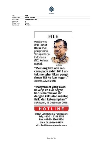 Title FILE Media Name Koran Jakarta Pub. Date 06 Agustus 2019 Page/URL 1 Media Type Koran Sentiment Positive Page 6 of 78.