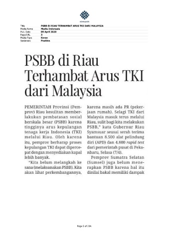 Title PSBB DI RIAU TERHAMBAT ARUS TKI DARI MALAYSIA Media Name Media Indonesia Pub. Date 09 April 2020 Page/URL 3 Media Type Koran Sentiment Positive Page 5 of 234.