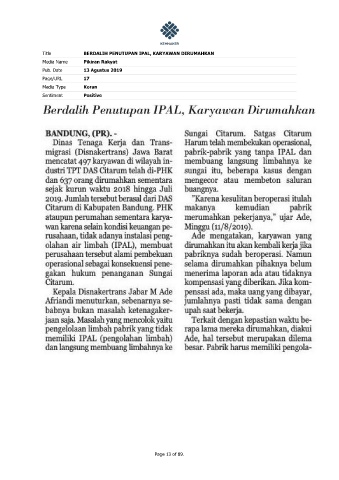 Title BERDALIH PENUTUPAN IPAL, KARYAWAN DIRUMAHKAN Media Name Pikiran Rakyat Pub. Date 13 Agustus 2019 Page/URL 17 Media Type Koran Sentiment Positive Page 13 of 89.