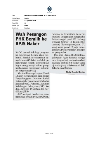 Title WAH PESANGON PHK BERALIH KE BPJS NAKER Media Name Kontan Pub. Date 13 Agustus 2019 Page/URL 11 Media Type Koran Sentiment Positive Page 7 of 89.