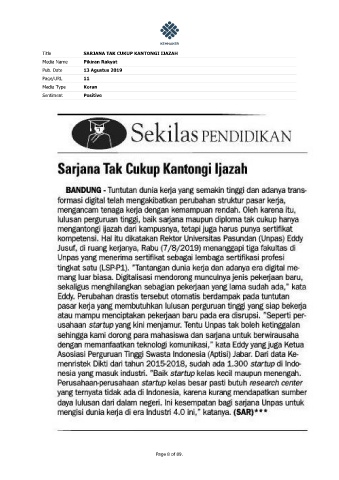 Title SARJANA TAK CUKUP KANTONGI IJAZAH Media Name Pikiran Rakyat Pub. Date 13 Agustus 2019 Page/URL 11 Media Type Koran Sentiment Positive Page 8 of 89.
