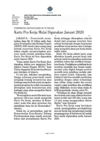 Title KARTU PRA KERJA MULAI DIGUNAKAN JANUARI 2020 Media Name Investor Daily Pub. Date 27 September 2019 Page/URL 21 Media Type Koran Sentiment Positive Page 12 of 49.