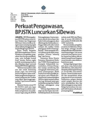 Title PERKUAT PENGAWASAN, BPJSTK LUNCURKAN SIDEWAS Media Name Koran Sindo Pub. Date 26 September 2019 Page/URL 13 Media Type Koran Sentiment Positive Page 19 of 49.
