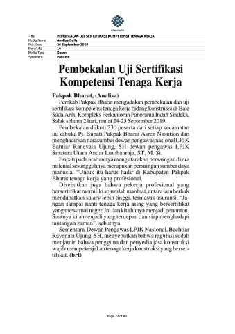 Title PEMBEKALAN UJI SERTIFIKASI KOMPETENSI TENAGA KERJA Media Name Analisa Daily Pub. Date 26 September 2019 Page/URL 16 Media Type Koran Sentiment Positive Page 29 of 49.